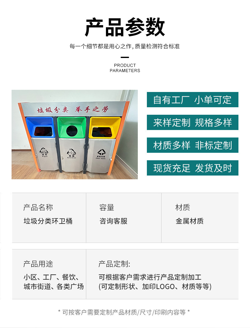 溫州東鴻金屬制造有限公司提供的戶外三分類不銹鋼垃圾箱為干濕分離環(huán)衛(wèi)垃圾箱/桶,可用于小區(qū)多分類垃圾箱/桶,并適用于小區(qū)、工廠、餐飲、城市街道、各類廣場、企業(yè)單位、花園、公園、學(xué)校、碼頭、風(fēng)景旅游區(qū)等公共場所,可按客戶的需要定投產(chǎn)品尺寸、材質(zhì)和印刷內(nèi)容,咨詢電話0577-88321654。