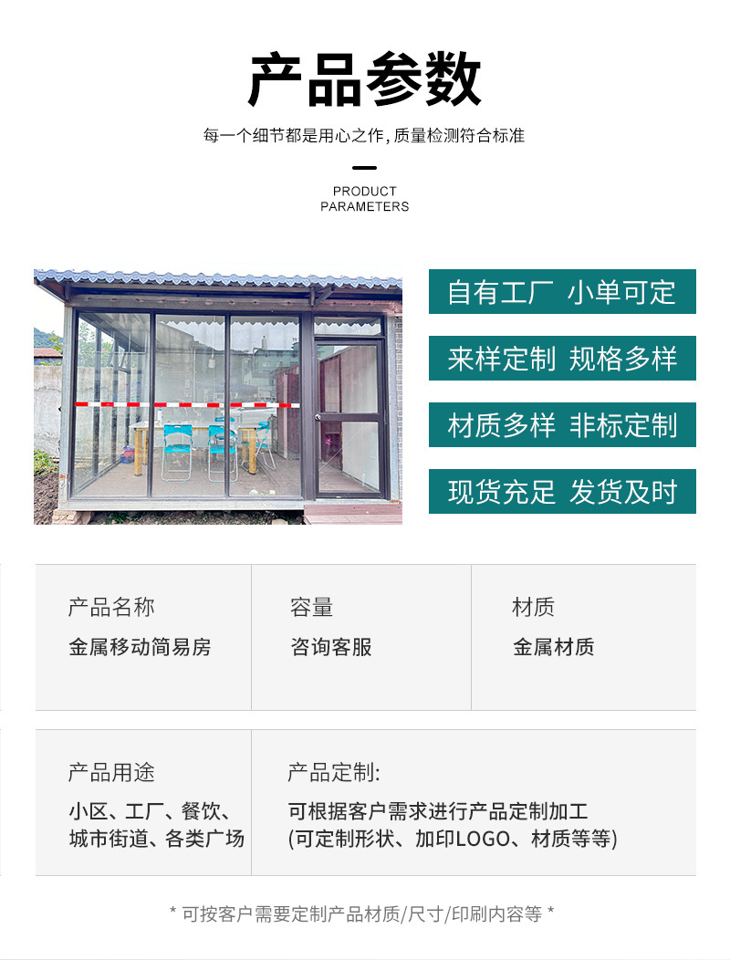 移動(dòng)簡易房批發(fā) 可拆卸材料便攜活動(dòng)版房 戶外活動(dòng)防水組裝屋子適用于小區(qū)、工廠、餐飲、城市街道、各類廣場、企業(yè)單位、花園、公園、學(xué)校、碼頭、風(fēng)景旅游區(qū)等公共場所,可按客戶的需要定投產(chǎn)品尺寸、材質(zhì)和印刷內(nèi)容